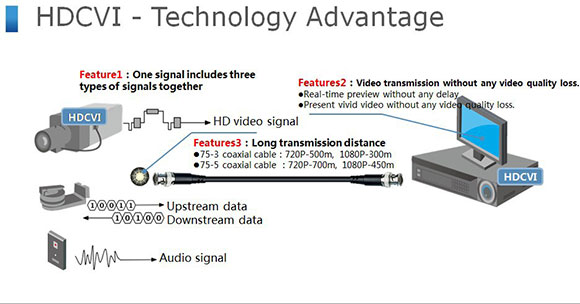 Các giải pháp HDCVI không chỉ làm cho việc truyền tín hiệu HD trơn tru trong đường truyền dài , Đơn giản hơn IP, cài đặt đơn giản, không có độ trễ hiệu suất trong thời gian thực. Không cần xử lý nén để duy trì chất lượng video ban đầu, nó có thể đưa ra hình ảnh sống động với chất lượng tốt so với các hệ thống tương tự khác , HDCVI có lợi thế khoảng cách truyền dẫn , vì nó có thể truyền tải 500m bằng cách sử dụng cáp 75-3 với tỷ lệ méo tín hiệu thấp.