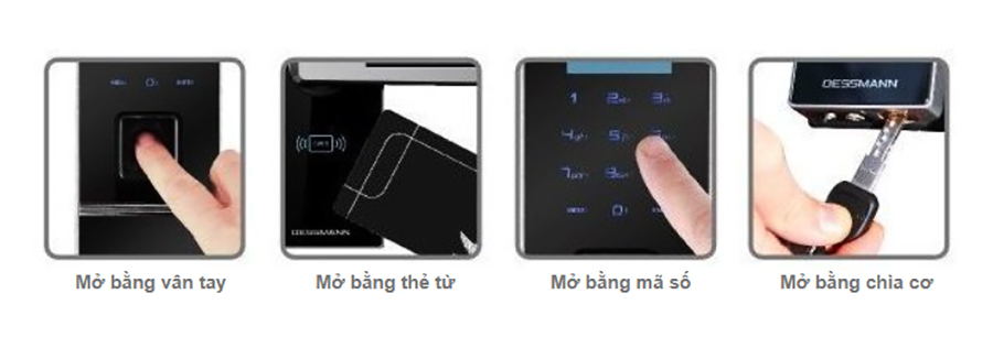 4 cách mở khóa: vân tay, thẻ từ, mã số hoặc chìa cơ dự phòng.